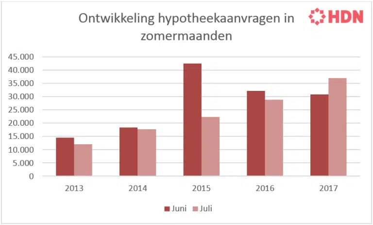 In de afgelopen maand, juli 2017, zijn er circa 37.000 unieke hypotheekaanvragen via het Hypotheken Data Netwerk (HDN) verzonden. Dat is een stijging van 19% ten opzichte van de maand daarvoor, toen er circa 31.000 hypotheekaanvragen verstuurd werden. Opvallend, doordat de maand juli doorgaans getypeerd wordt door een duidelijke zomerdip in het aantal hypotheekaanvragen.