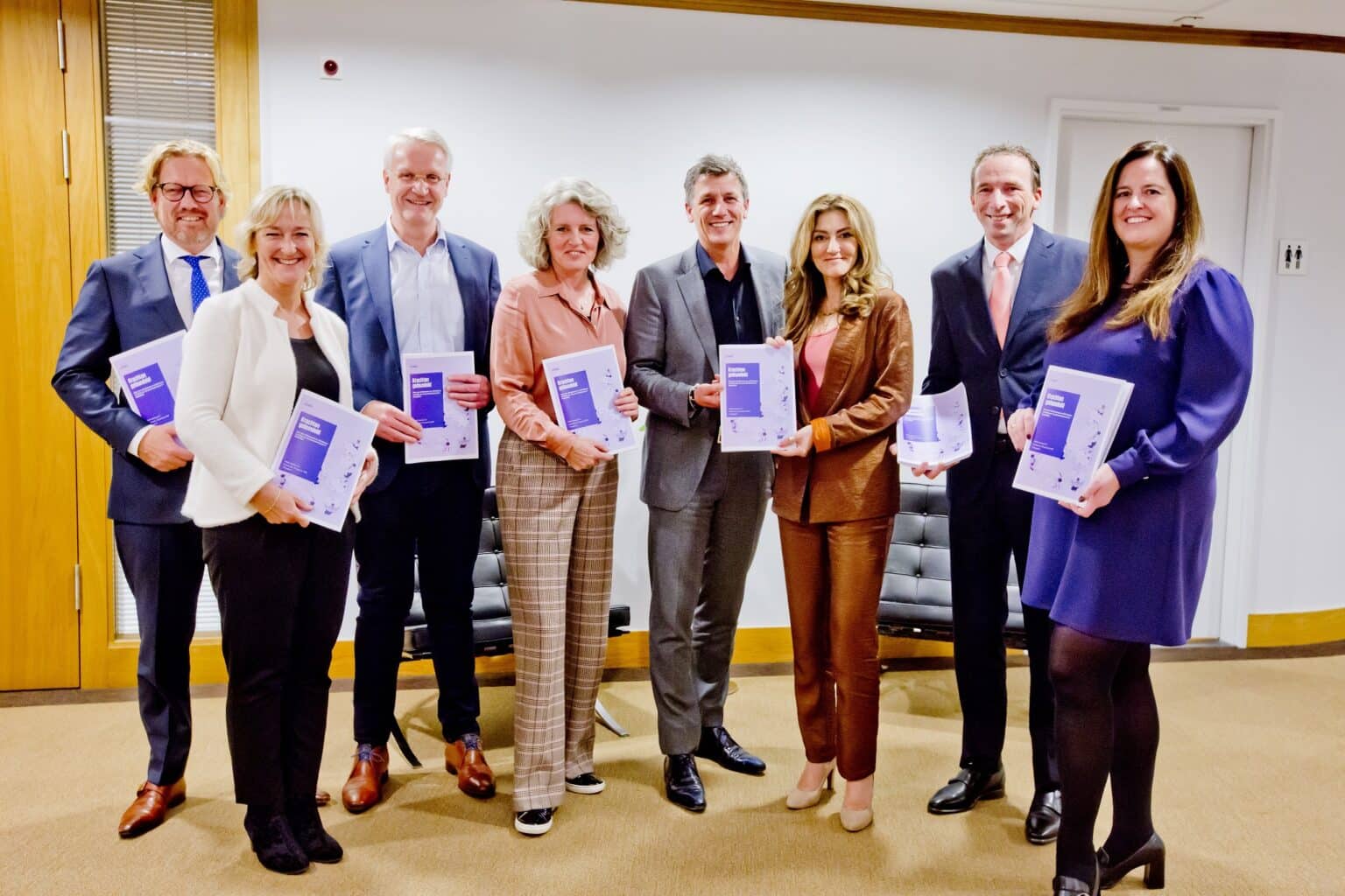 Foto: minister van justitie en Veiligheid Dilan Yeşilgöz-Zegerius (derde van rechts) ontvangt het rapport. Rechts van haar VBO-directeur Hans van der Ploeg.