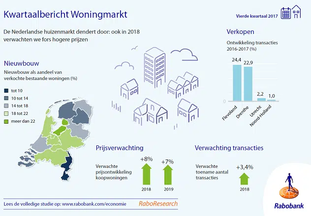 Huizen in Nederland werden in 2017 gemiddeld 7,6 procent duurder. Naar verwachting zullen de prijzen in 2018 nog harder stijgen. Dat schrijven economen van de Rabobank in het vandaag verschenen Kwartaalbericht Woningmarkt. Zij gaan uit van een prijsstijging van 8 procent in 2018 en 7 procent in 2019. Dit betekent dat een gemiddeld huis in Nederland over twee jaar zo’n 300.000 euro kost. Dat is niet louter positief: niet alleen kan het ervoor zorgen dat een koophuis voor een groeiende groep starters minder bereikbaar wordt, het kan ook leiden tot hogere schulden van huishoudens.