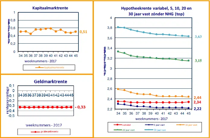 De daling van de rente op de kapitaalmarkt kwam afgelopen donderdag abrupt tot stilstand. Oorzaak was de vrees bij beleggers dat de belastingplannen van de Amerikaanse president Trump vertraging oplopen. De marktrente eindigde vrijdag uiteindelijk iets hoger dan de week daarvoor. Het aantal verlagingen door geldverstrekkers van de hypotheekrente nam wel toe. Ook aanbieders als Aegon, SNS Bank en Argenta, die hun rentetarieven minder vaak aanpassen, voerden afgelopen week verlagingen door. Dat lijkt een teken dat de daling van de hypotheekrente structureel van aard is. Sinds half juli is de gemiddelde rente op met name de (middel)lange rentevaste perioden al weer tussen de 0,15% en 0,20%-punt gezakt.