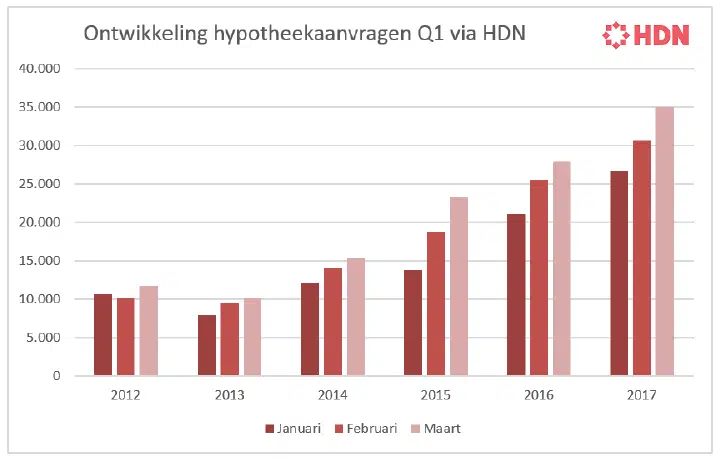 In het eerste kwartaal van 2017 zijn circa 92.500 unieke hypotheekvragen via het Hypotheken Data Netwerk (HDN) verzonden. Dat is 24% hoger dan in het eerste kwartaal van 2016, toen er zo’n 74.500 aanvragen werden verzonden.