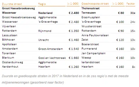 In bovenstaande tabel zijn de duurste en goedkoopste straten voor heel Nederland en voor de zes regio’s met de meeste miljoenenwoningen opgenomen. Dit zijn Agglomeratie ‘s-Gravenhage, Rijnmond, Utrecht, Groot-Amsterdam, Gooi en Vechtstreek en Agglomeratie Haarlem. De verhouding tussen de duurste en goedkoopste straat (‘factor’) is het grootst in de regio ’s-Gravenhage. Daar ligt de gemiddelde woningwaarde in de duurste straat (Groot Haesebroekseweg in Wassenaar) 24 keer hoger dan de gemiddelde woningwaarde in de goedkoopste straat (Erasmusplein in Den Haag). Ook in de regio Rijnmond is het verschil groot. De duurste en goedkoopste straat liggen binnen deze regio beiden in Rotterdam. Woningen in de Vijverlaan zijn 15 keer meer waard dan woningen in de Wuysterstraat.